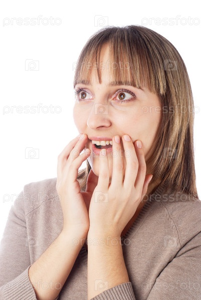Портрет удивленной женщины на белом фоне