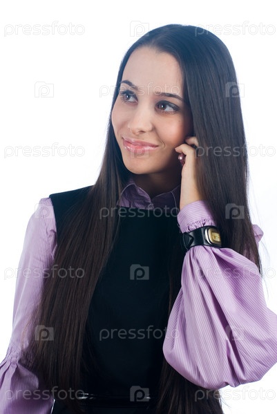 Девушка говорит по мобильному телефону на белом фоне