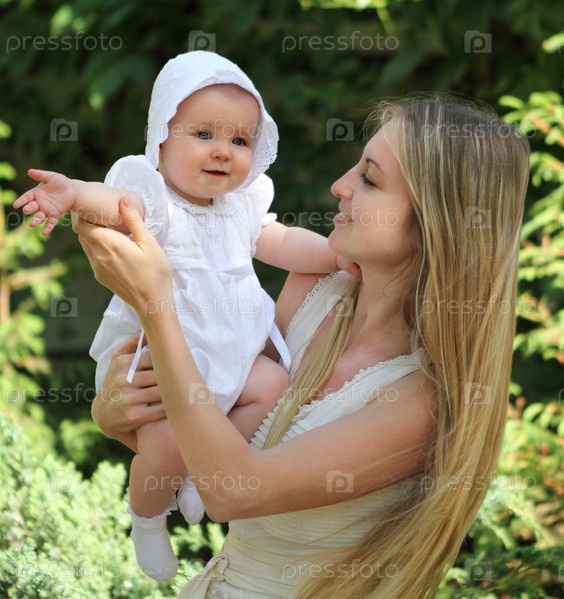 Молодая мать и ее малышка дочь весело проводят время в летнем саду