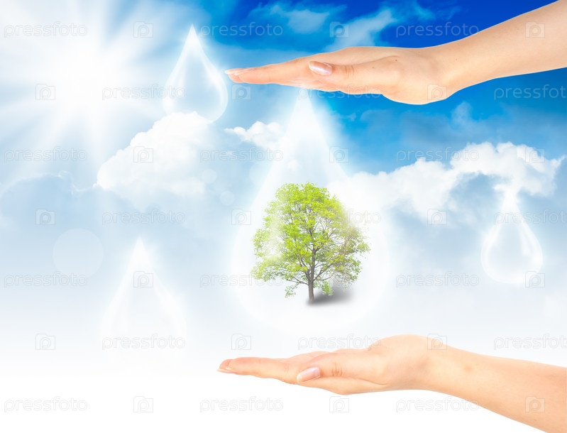 Капли на фоне голубого неба и облаков. Символ защиты окружающей среды