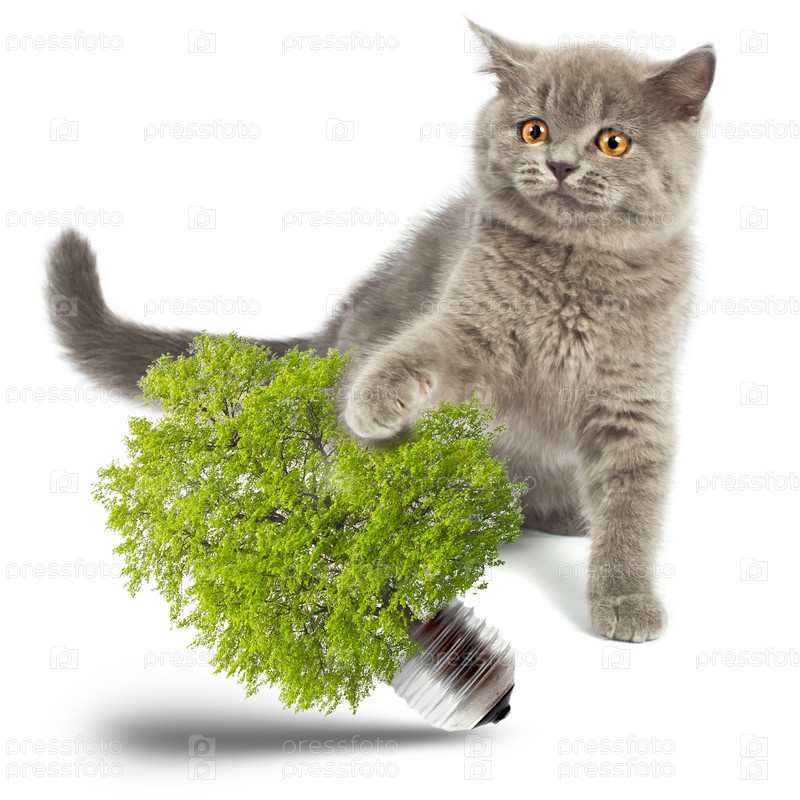 Британский котенок играет с деревом на белом фоне