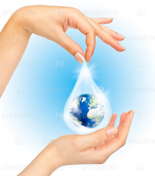 Рука держит каплю с Земным шаром внутри