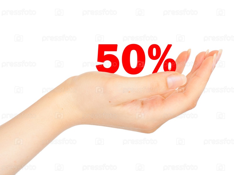 Скидка в пятьдесят процентов в ладони женщины. Изолированно на белом фоне