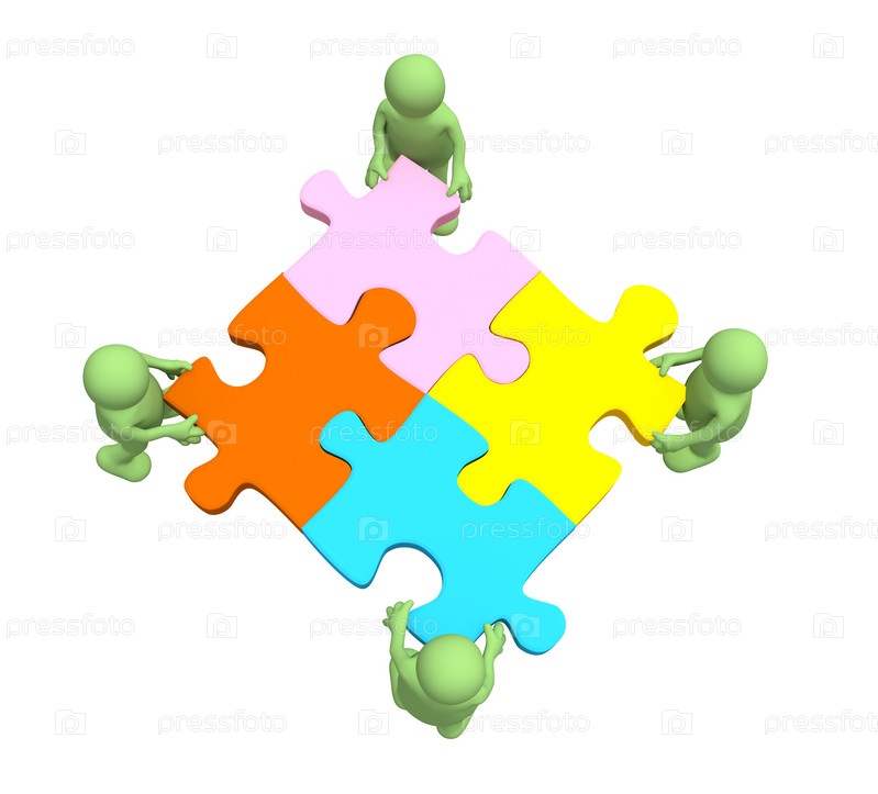 Четыре маленьких человека, держащие в руках разноцветные кусочки головоломки