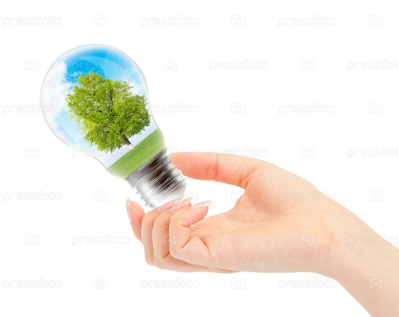 Лампочка с деревом внутри в руке изолированы на белом фоне. Экологическая концепция возобновляемых источников энергии