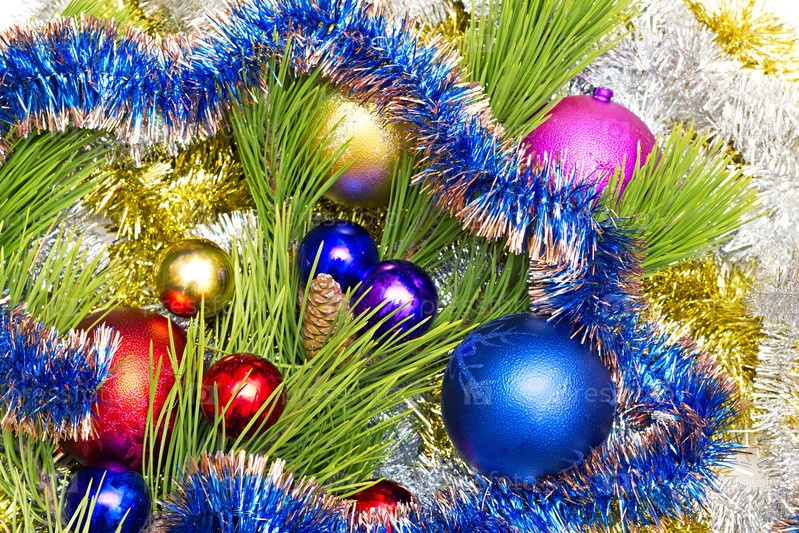 Сосновые ветки с шишками и рождественскими украшениями