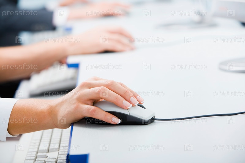 Ряд рук, касающихся компьютерных мышей, лежащих на столе