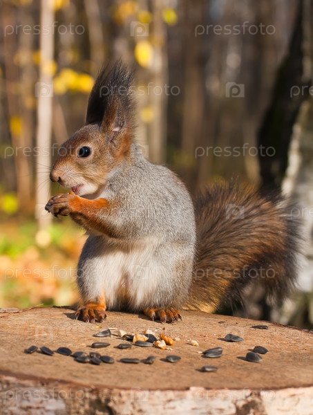 Белка на пне в осеннем парке