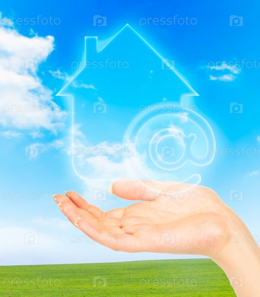 Рука держит символ домашнего интернета на фоне природы. Концепция домашнего интернета