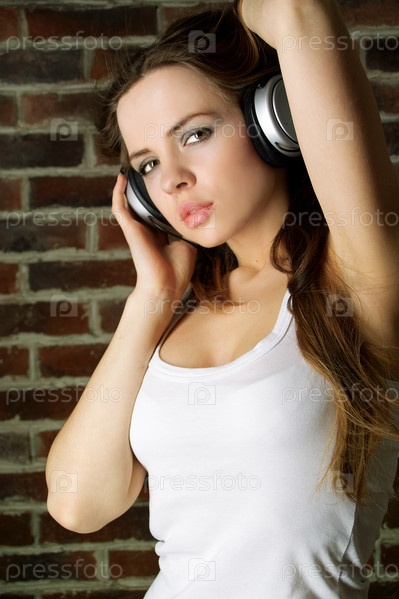Портрет красивой молодой девушки с наушниками на фоне кирпичной стены