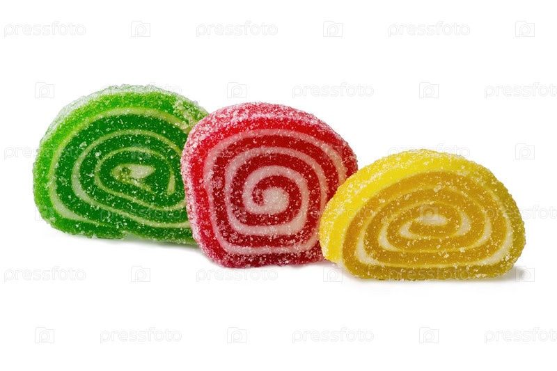 Три кусочка разноцветного мармелада на белом фоне