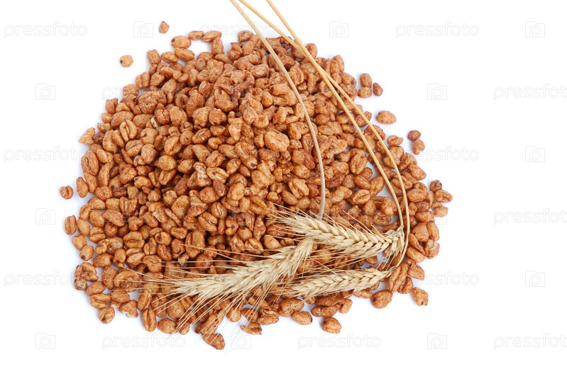 Зерновые хлопья и колосья пшеницы на белом фоне
