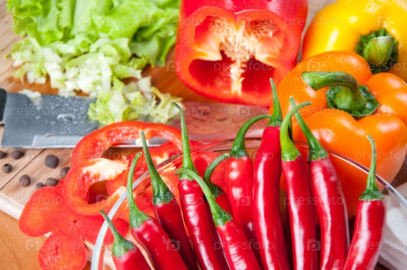 Болгарский перец, перец чили и зеленый салат на кухонном столе