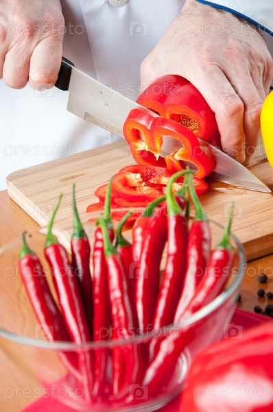 Руки шеф-повара, нарезающего болгарский перец