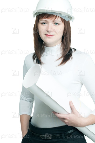 Молодая женщина-архитектор в защитной каске с чертежами в руках, белый фон