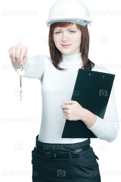 Молодая женщина-архитектор в строительной каске, показывающая ключи от нового дома
