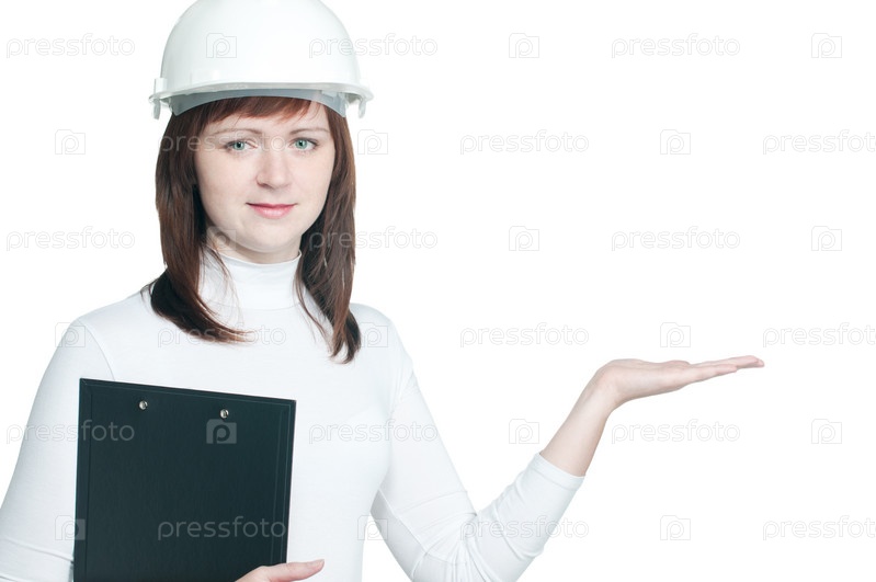 Молодая женщина-инженер в строительной каске, показывающая рукой на место для текста