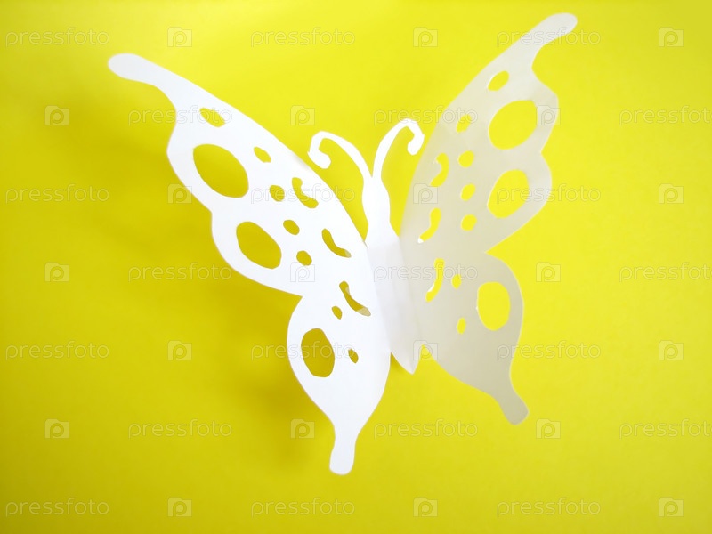 Белая бумажная бабочка на желтом фоне