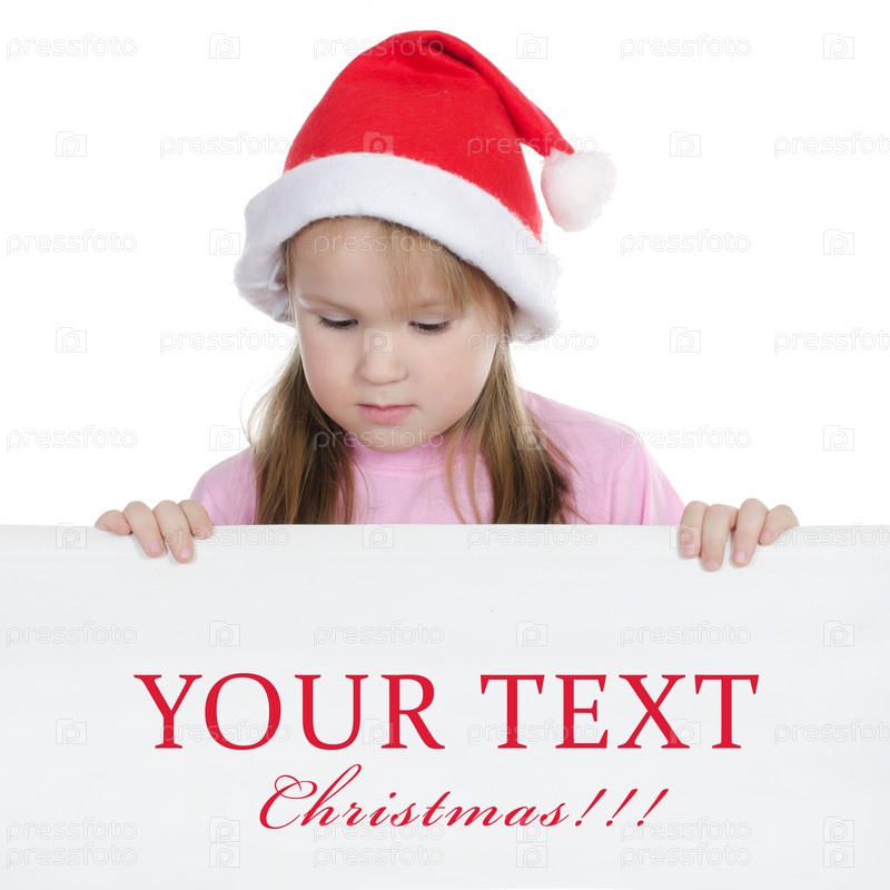 Девочка в колпаке Санты держит пустой баннер