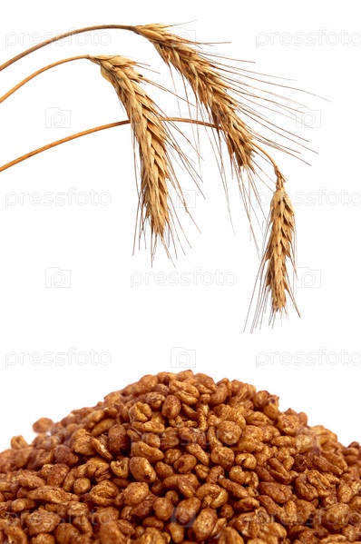 Зерновые хлопья и колосья пшеницы на белом фоне