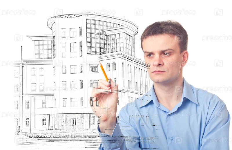 Мужчина рисует эскиз офисного здания