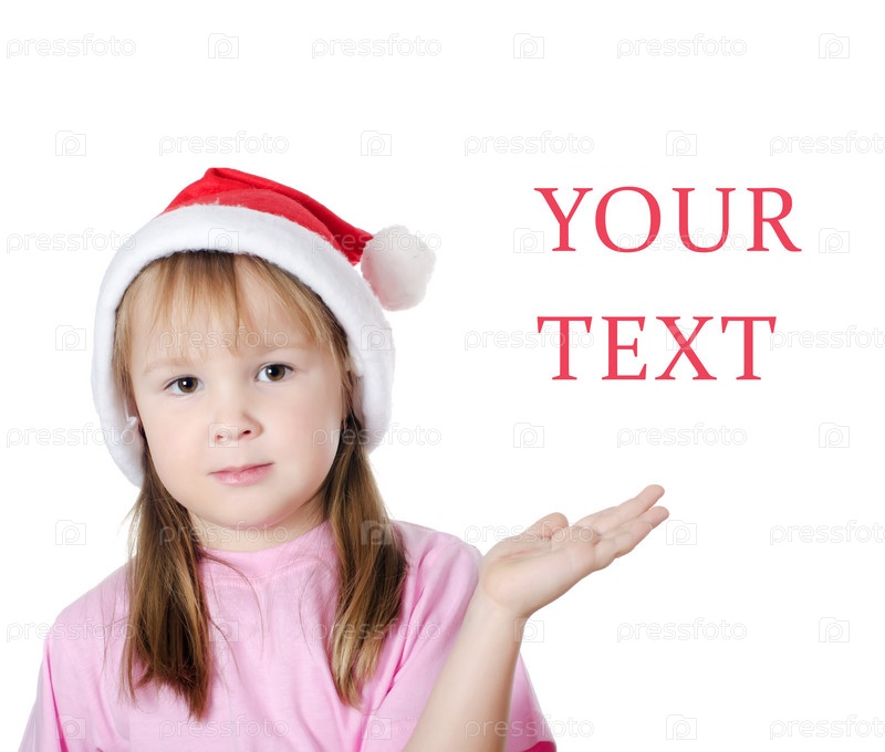 Девочка в колпаке Санты указывает рукой на пустой шаблон