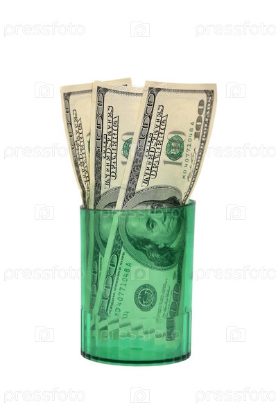 Доллары в стакане на белом фоне