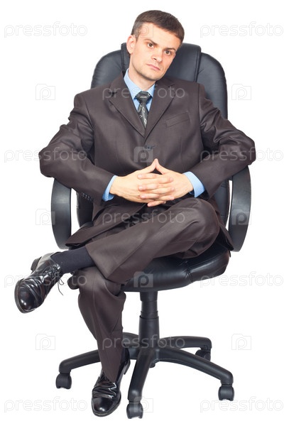 Молодой предприниматель, сидя на стуле, на белом фоне