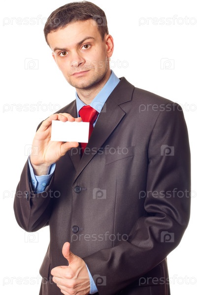 Молодой предприниматель держит в руке визитную карточку, на белом фоне