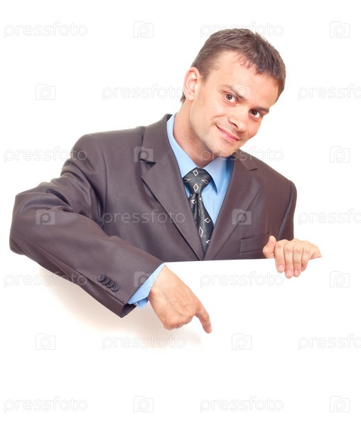 Молодой предприниматель указывает пальцем, на белом фоне