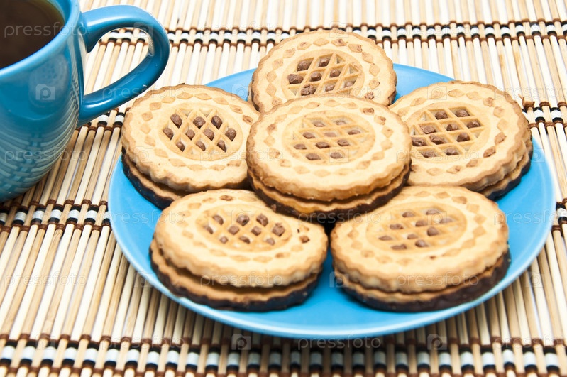 Печенье на блюдце и чашка кофе на бамбуковой салфетке