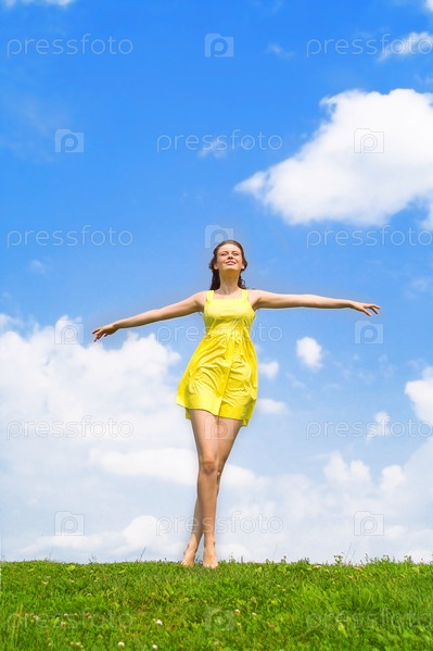 Красивая девушка в желтом платье и с рыжими волосами, наслаждающаяся летом