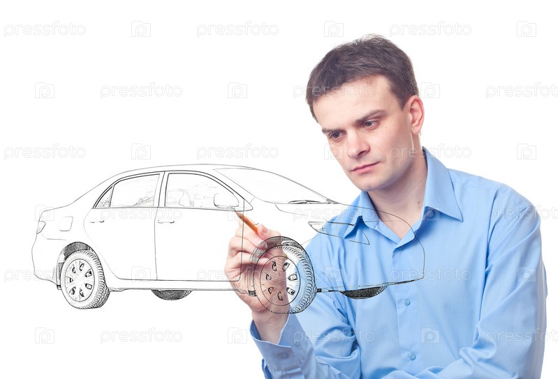 Мужчина рисует автомобиль на белом фоне