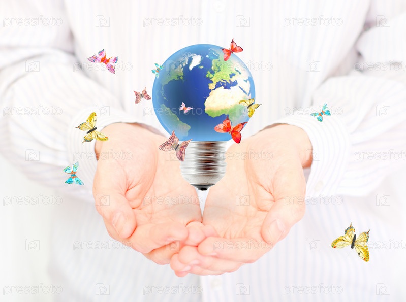 Руки держат лампочку в виде планеты Земля. Концепция возобновляемой энергии будущего