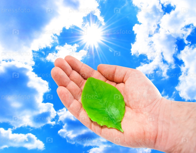 Рука мужчины с молодым зеленым листом