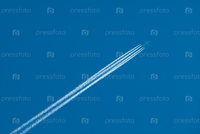 Летящий самолет и след от него в синем небе