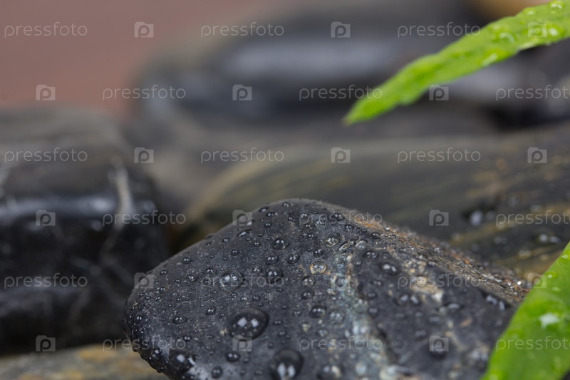 Гладкие камни и зеленые листья крупным планом
