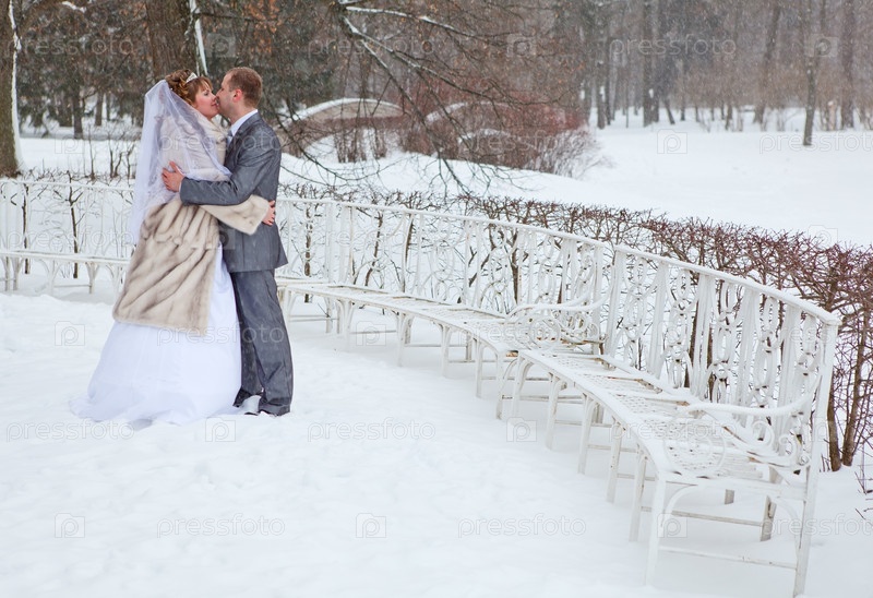 Счастливые молодожены в зимнем парке