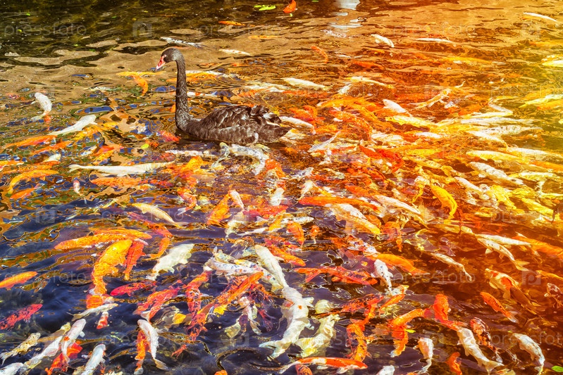 Черный лебедь в пруду с рыбой