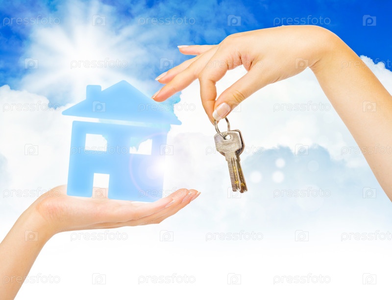 Руки держат ключи и дом на фоне неба