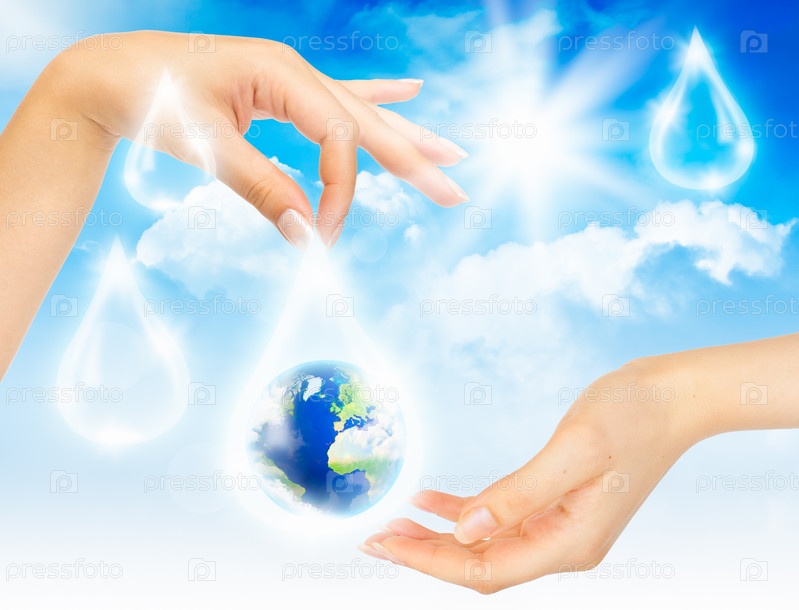Руки держат планету в капле воды на фоне неба