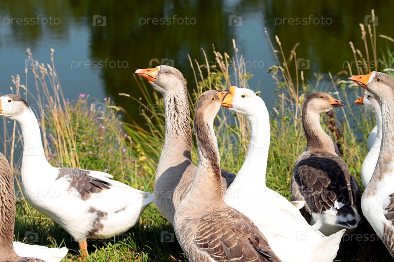 Серые и белые гуси возле пруда