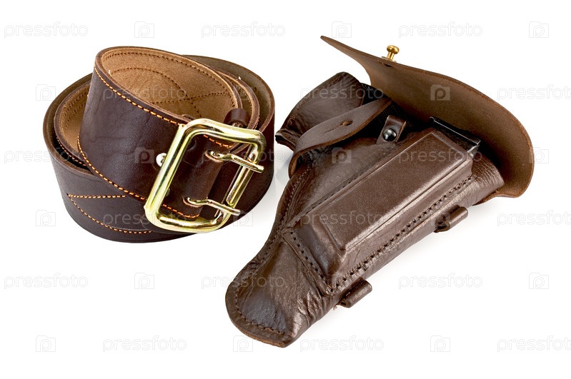 Рулон коричневого широкого ремня с блестящей желтой пряжкой и кобура пистолета из кожи изолировано на белом фоне