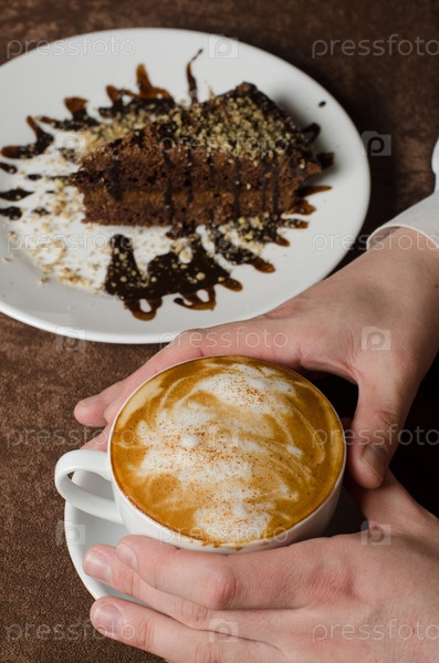Чашка капучино в женских руках и кусок торта на тарелке
