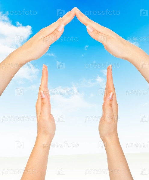 Домик из рук на фоне неба