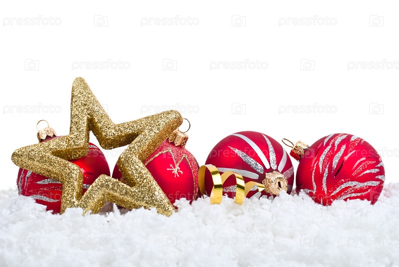 Золотая пятиконечная звезда и красные шары на фоне снега