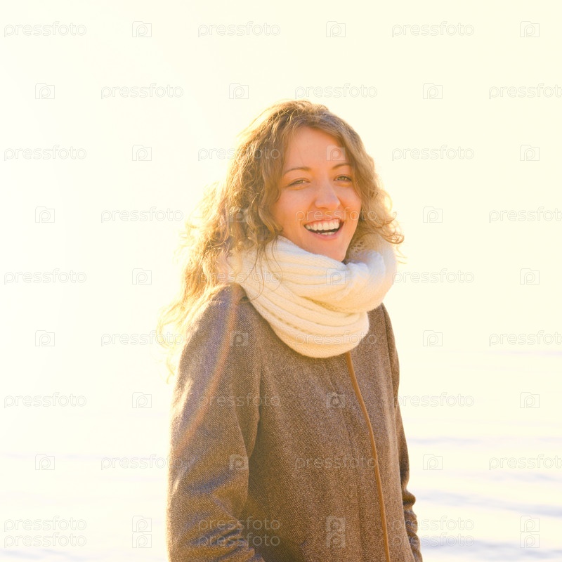 Женщина в белом шарфе улыбается на светло-желтом фоне