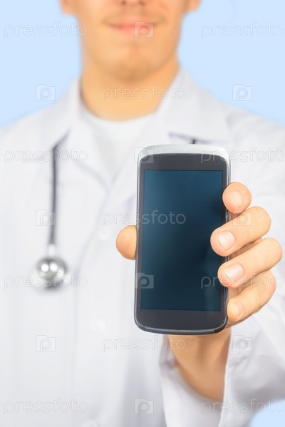 Врач держит мобильный телефон
