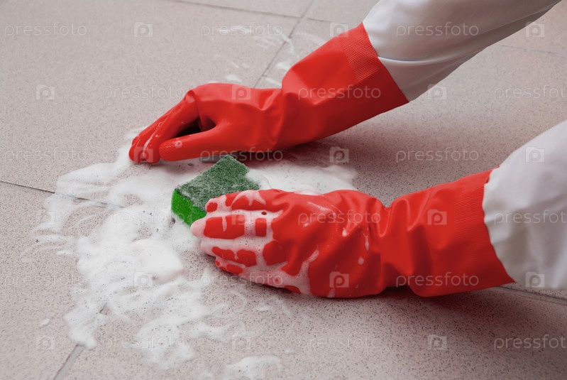 Моющее средство на полу и руки в защитных перчатках