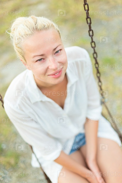 Молодая блондинка на качелях